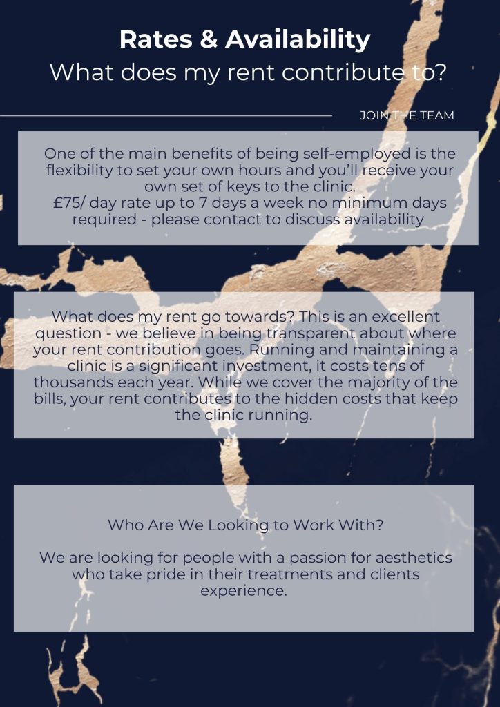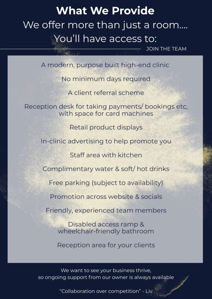 If you specialise in a treatments and would like to work with us please contact Liv on – 07837589847.